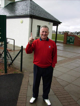 Club Champion Iain Burnett narrowly lost out in the qualifying rounds for the matchplay stages of the Tassie tournament today. Iain shot a great 67 over the Burnside Course yesterday followed by a 89 in horrendously windy conditions over the Championship today, leaving him on a nett score of 156. It transpired that this was the ‘cut’ for the Maulesbank handicap tournament and unfortunately Iain missed out on a count-back. I personally blame his caddie (who shall remain nameless). Yes – Richard’s only advice to Iain was to ‘slow down’. Anyway, well done to Iain for representing the Club – there’s always next year! On a lighter note, Iain displayed a couple of lovely outfits. On Monday, a rather fetching pinkinsh top, set off with checked trousers and a matching traditional flat cap. Today, a more sombre feel with black troos red shirt and jacket complemented with a lovely black Station Masters penter’s cap.