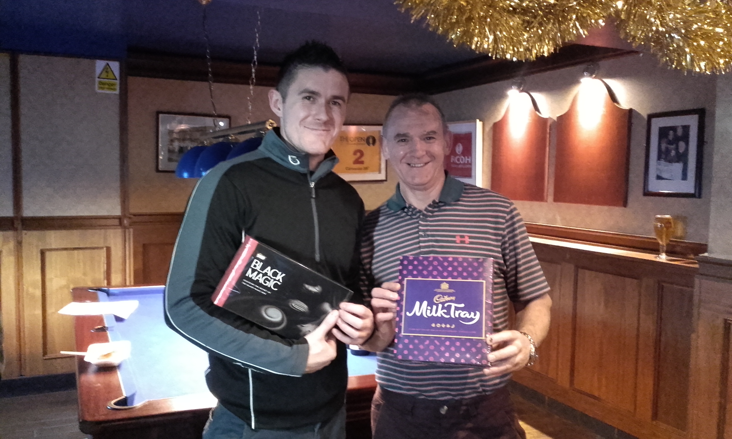 20161227_142349 January 3, 2017 2560 × 1536 Latest News in Pictures Half the runner’s up team turn-up for the prize-giving. Alan Clark and son Garry bag the choccies